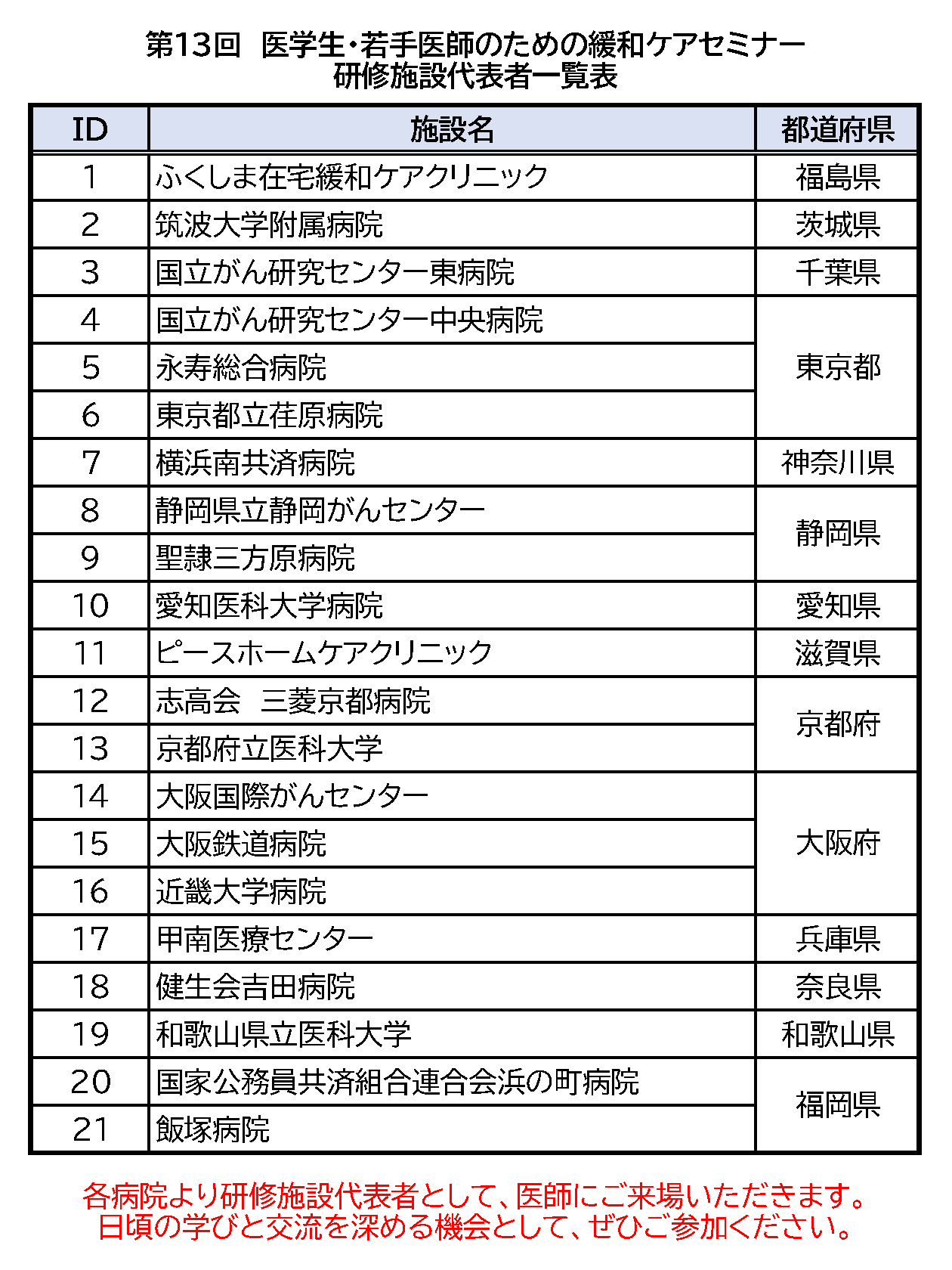 緩和ケアに興味があり、セミナー参加を検討している方々へもご紹介させていただきたく、当学会ウェブサイトの医学生・若手医師のための緩和ケアセミナーのページ内に施設紹介プログラムを掲載予定でございます。